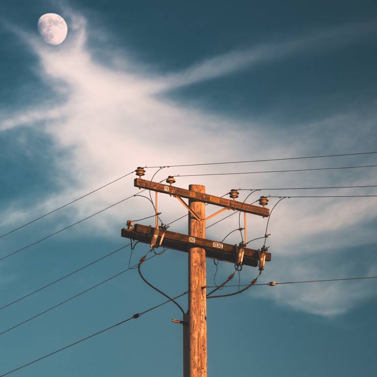 The moon during daytime, seemingly reached for by the clouds while hovering above a power pole. Photographed with a long-reach tele lens.