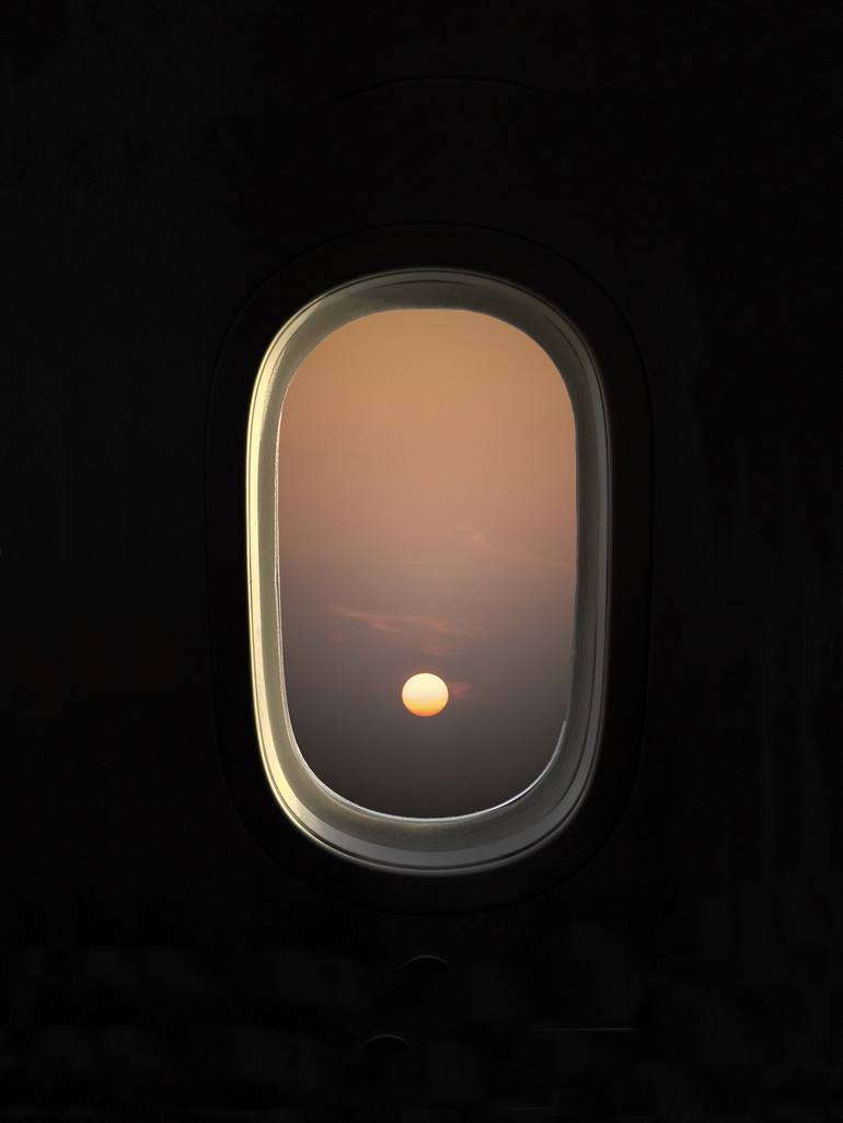 Highlighting the stark contrast, the airplane window frame serves as an eloquent boundary that encapsulates this celestial visage, evoking a sense of quiet reverence and contemplation. The darkness surrounding the window creates an isolated focus on the vibrant center, drawing viewers into an intima...