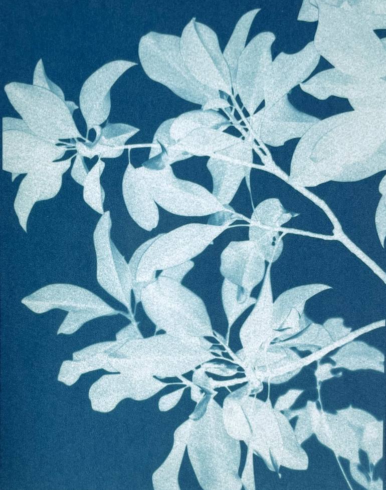 Clients include: Timothée Chalamet, Starbucks, Ritz Carlton, Mayo Clinic, Jumaira Resort (Dubai), Wyndham Worldmark Hotels, Kimpton Hotel Monaco, Evercore NY, Apollo Global Management, NY, Mazars Accounting NY, Limelight Mammoth Hotel & Residences, MD Anderson Hospital, Houston Methodist Hospital, Oakland International Airport. Christine So is a painter, photographer and printmaker living across the San Francisco Bay in the hills of Oakland, California. Her works are heavily inspired by the woods where she has lived and hiked for decades. She works in acrylic and in the antique photographic process of cyanotypes. She creates botanical and abstract prints without a camera lens, as well as hand-printed landscape photographs of the foggy woods where she lives. Whether it’s painting, printmaking, or photography, her work is always nature-inspired and nearly always monochromatic. She has worked in a dozen mediums, cycling back and forth from painting to printmaking to cyanotype, applying effects from one medium to the next. She bridges the mediums of photography, monoprinting and painting. Her favorite question when working in the antique photographic process of cyanotypes is “What would happen if…?” She has devised a range of atypical techniques using the cyanotype process. Arguably the most striking of her unique methods are her cyanotype paintings in her Delft Garden series. The painted silhouettes of plants each contain an intricate blue and white pattern within them when viewed up close.The lengthy process begins as a pencil drawing which is then painted in–not with ink or paint–but with the cyanotype light-sensitive mixture in a dark room. It’s a tricky process as it’s hard to see what one is painting in very dim light. Days later once the photography chemicals have dried in the painting, she lays plants on top of the painted silhouette in a pattern that will leave gaps similar to lace. She then carefully moves the entire bundle outside and exposes the pattern to sunlight to create the image-within-the-image. The blue and white pattern seen in each leaf resembles painted Delft pottery, thus the title of this series: Delft Garden. Another of the artist’s innovative techniques is her series of completely abstract cyanotypes printed without photo negatives or stencils.