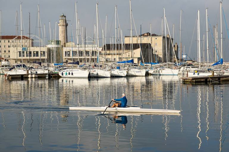 Original Artwork (Limited Edition): The motif is printed on Hahnemühle fine art baryta 325g paper, motif size 20 x 30 cm, white border 5 cm, outer size 30 x 40 cm, signed and artist stamp on the back. A lone rower glides through the calm waters of Trieste Harbor, with the iconic lighthouse standin...