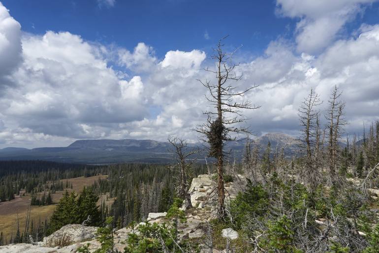 A rugged Utah mountain landscape is depicted with a mix of lush greenery and barren trees. The sky is filled with thick, rolling clouds, suggesting dynamic weather conditions.