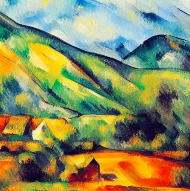A.I. created print an interpretation from my description representing a selection of small building gathered together adjacent to fields of corn surro9und by bushy trees and rolling grassy hills.