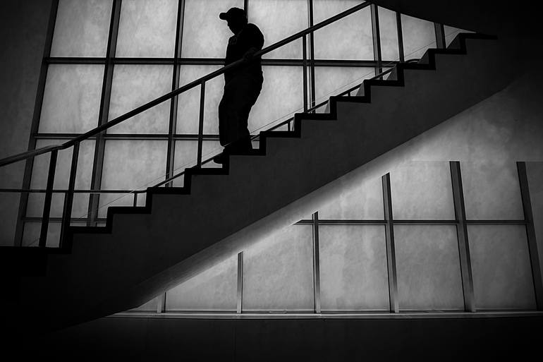 A lonely figure on the stairs in silhouette in New York City's Museum of Modern Art projects the feeling of loneliness and detachment. Limited Edition Print: 2 / 10