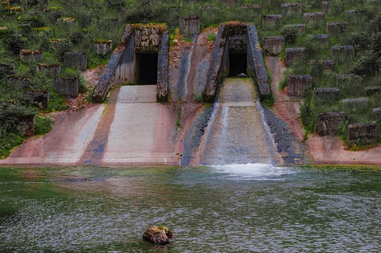 Mystic mood of a lake with floodgates of a dam, photography captured in the wood near Innsbruck/Austria. Printed with pigment ink on canvas in wooden stretcher, mounted in a wooden floating frame. Signed at the back, with certificate of authenticity. Ready to hang.