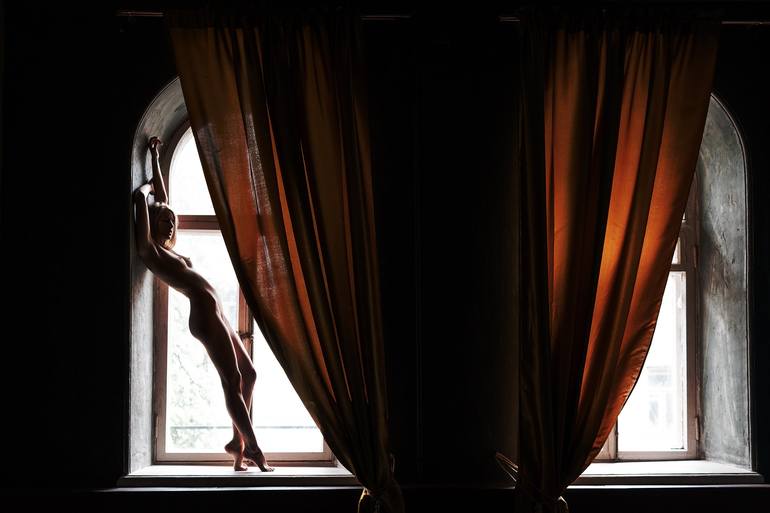 Limited Original Edition Giclée Print on Hahnemühle Paper, signed, numbered and with a Certificate of Authenticity. Niche is a space of tender withdrawal—where silence echoes in fabric, corners, and breath. A woman leans into a curtain, wraps herself around a chair, rests in the light between two...