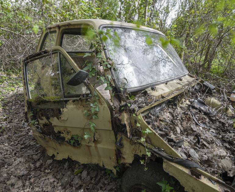 Partly faded old photographic prints gave me the idea of desaturating the colours but emphasizing the green leaves. I hope viewers will feel moved by natures ability to reclaim mans rubbish back to the soil.