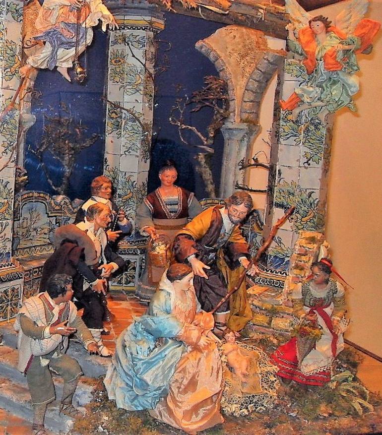 Neapolitan artistic nativity scene set in a majolica cloister with columns with bagpipers and angels.Artistic photographs of nativity scenes, made in Italy, in the city of Naples. The Neapolitan nativity scenes are made only by hand by skilled artisans who use precious and ambient materials that da...