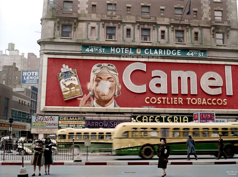 Photography: Detailed Colorized photo New York 1943, Times Square. Original photograph by John Vachon. Photo colorized by Coloriginals. Amazing historic streetlife in Colour. Printed on Fineart Baryta Photopaper. The Coloriginals large format photos are available in limited editions and are provi...