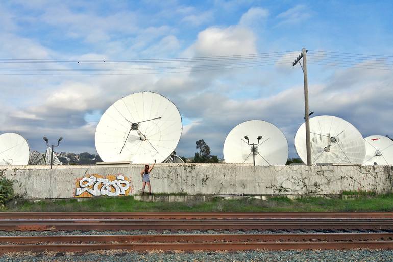 Almost got hit by an Amtrak train shooting this but it was worth it. I have driven past these satelite dishes so many times and thought of using the idea of never being able to find a signal with our phones. My friend Dana is super tall so knew she would be perfect for this shot. Printed by the art...