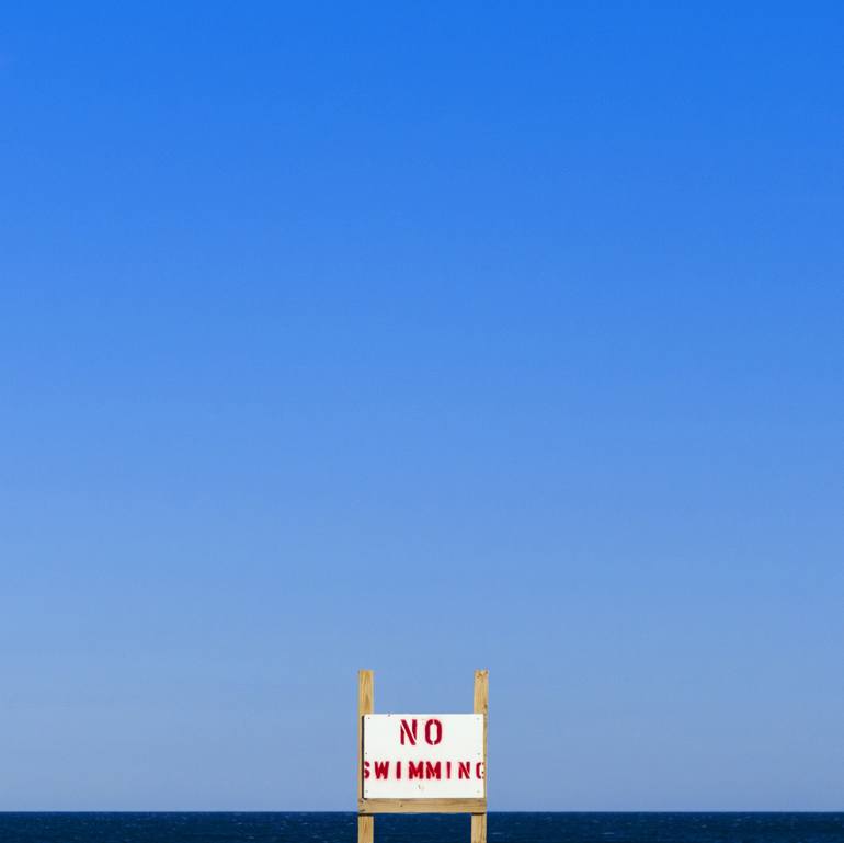 I find this image mysterious. The empty blue sky and the sliver of sea evokes a sense of calm. That calm is broken by a stark and roughly made "No Swimming" sign. Why is there no swimming, what is hidden below the frame? Image size is 18.5"x18.5" on 20"x20"printed on Hahnemuhle FineArt Baryta Satin...
