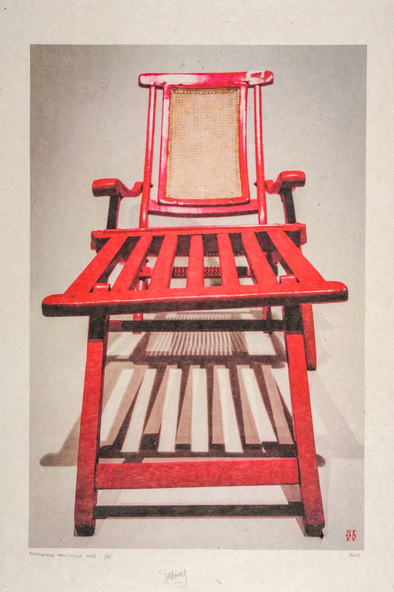 An image of a wooden deck chair from the famous cruise ship Normandie dated 1935. The image is printed on an archival acid free handmade paper using archival Epson pigment inks. Each sheet of paper is unique with its own inclusions and textures adding to the textural feel of the prints. Actual image...