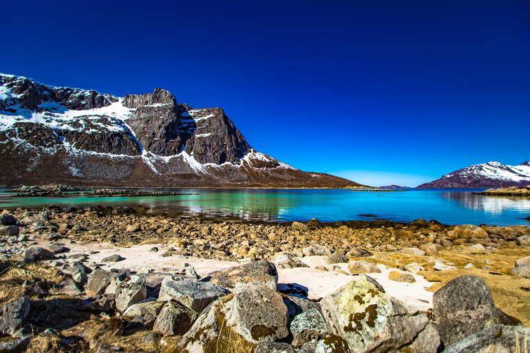 Capture the serene beauty of the Norwegian fjords with this stunning photorealistic landscape. The artwork, a vibrant colour photograph, embodies the essence of a sunny early spring day in Northern Norway. This piece is a window to the heart of Scandinavia, bringing the tranquility of the fjords rig...