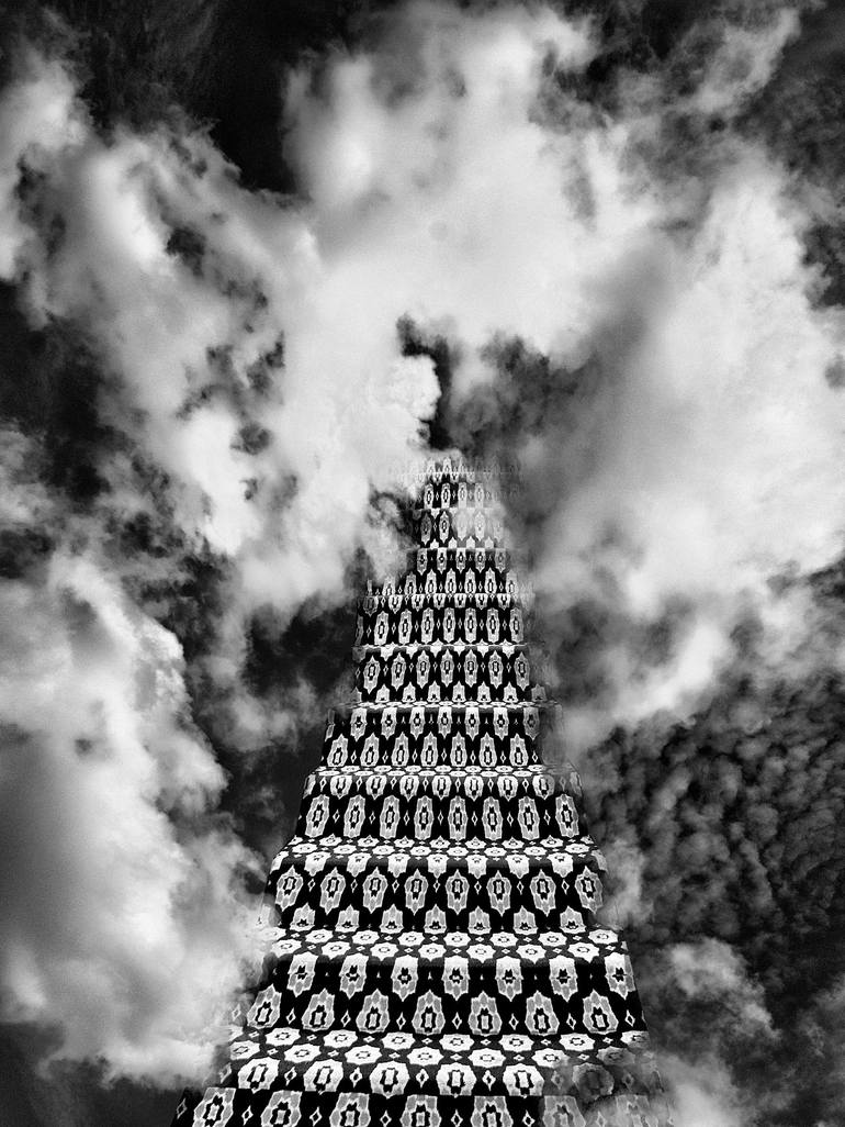 A dramatic black and white surreal image of the iconic patterned stairway at the former midcentury Riviera Hotel and Resort in Palm Springs California enhanced with dreamy desert clouds, photographed and created by William Dey. The Surreal Show Infinite Exposure Art Exhibition University of CA Palm ...