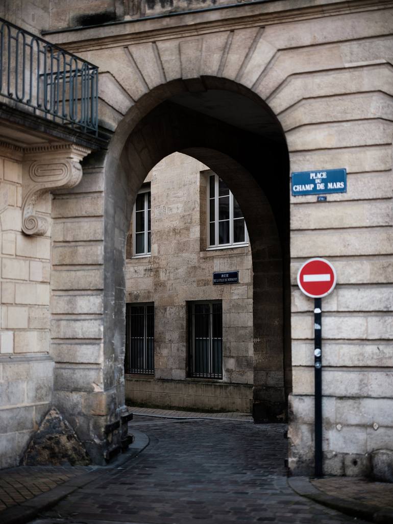 A captivating colour image showcasing an arched pass-through in the historic old section of Bordeaux, France. The pass-through is framed by aged stone walls, rich in texture, and accented with the warm, golden tones of the surrounding buildings. The archway leads into a charming, narrow alleyway, in...