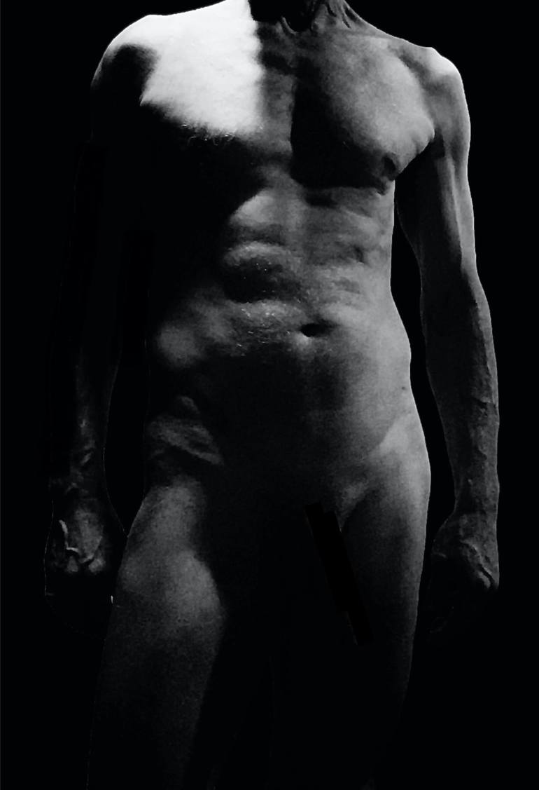 A monochrome depiction of a muscular mature male form is highlighted dramatically against a dark background, emphasizing the play of light and shadow on the figure's contours. The use of chiaroscuro enhances the visual impact, focusing on the anatomy and structure.