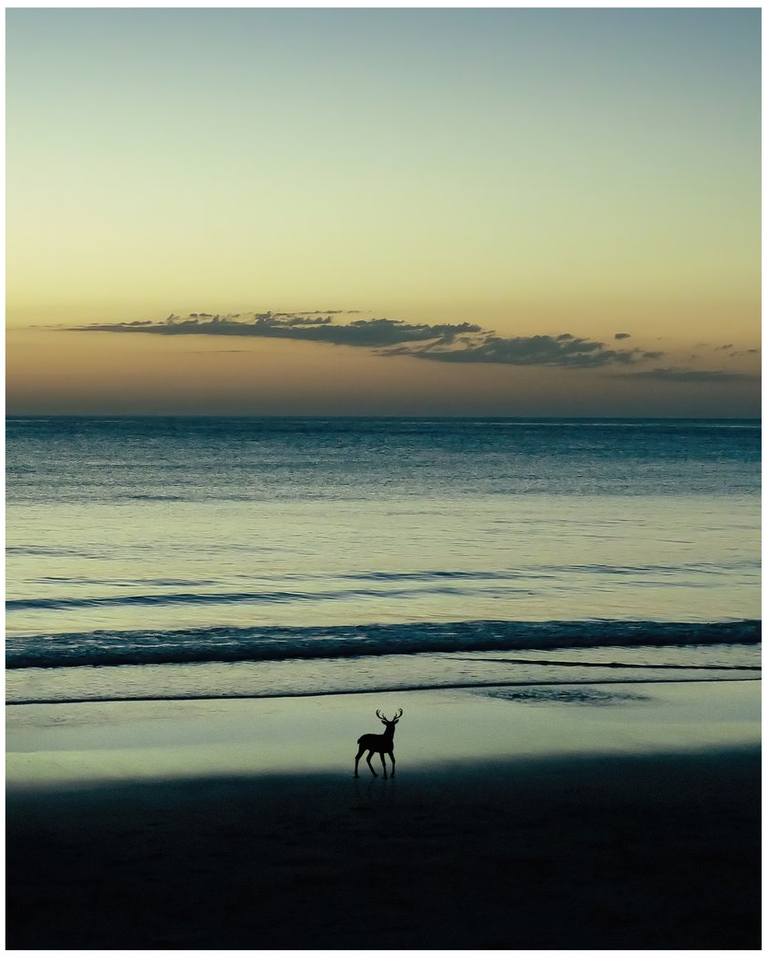 A lonely deer standing still on a calm beach in the dusk. Original photograph has no white/gray border. Open Edition prints available in the Prints tab.