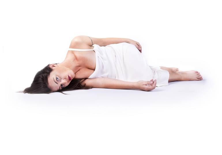 Allegoric view of the story of Ophelia, beautiful female laying in white dress on white background, starring at you...