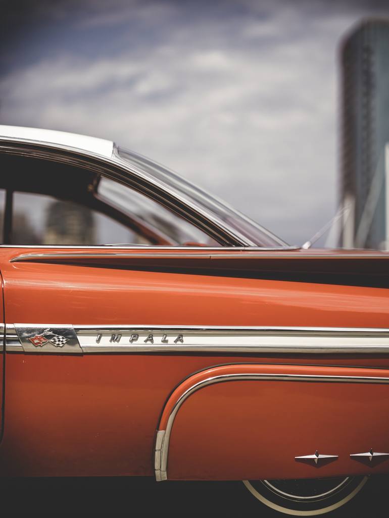 An orange 1959 Chevrolet Impala against a high-rise of the San Diego, CA skyline.
