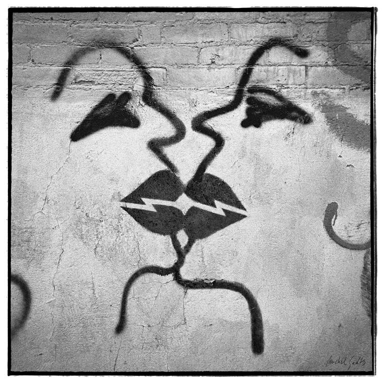 A graffiti art to express a broken love. Two androgynous profiles—with lips drawn like broken heart—kiss on the mouth. (Captured on 35mm Tri-X film, New York, NY, December 1983) Check my portfolio for another photograph on the same team—search for “Michel Godts Lips R Razorblade” • Black and whit...