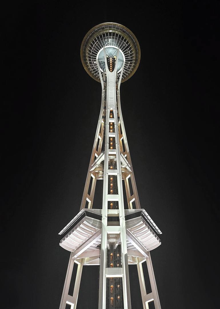 Photograph from under the Space Needle in Seattle, WA at night.