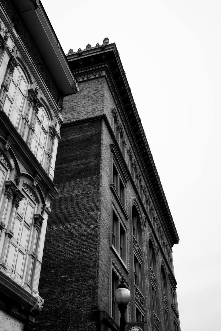 This is a black & white photo from a city whose once thriving downtown is now rundown from abandonment, despite the amazing architecture the buildings have. These overlooked structures used to overlook a booming place. (See what I did there?) I like 20"x 30" sizing (it's perfect for almost anywh...