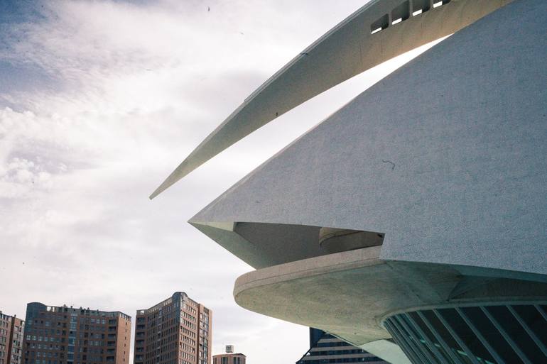 This photograph captures the Palau de les Arts Reina Sofía in Valencia, Spain, designed by Santiago Calatrava. The architecture seems to be touching the city's skyline in a similar manner like Michelangelo's "The Creation of Adam". Proposal from artist: 90 x 1,35 m metal print in 25 mm Aluminium Ar...