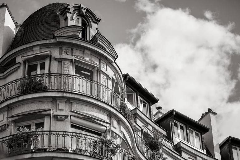 Elevate your space with this stunning photograph showcasing the timeless beauty of Parisian residential architecture. The image captures the graceful curves of a classic Parisian building, with its charming balconies adorned with ornate iron railings and French doors that open to the world beyond. S...