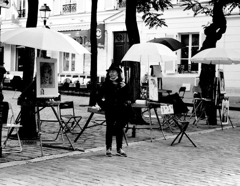 This photo of an artist standing alongside her work of art, looking rather skeptical about its success. It was taken in Montmartre in Paris on a Sunday morning.. In this monochrome photograph, I aimed to capture the essence of a vibrant artists' quarter, the black and white tones lend a timeless ...