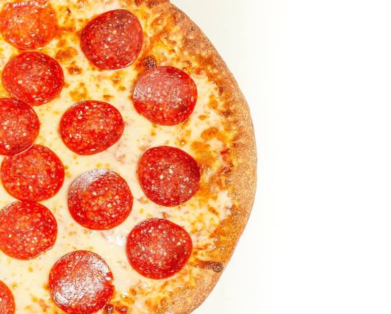 A section of freshly made pepperoni pizza. Note: this work is printed on aluminum, and has a wall mount attached. It does not need to be framed.
