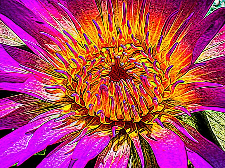This photograph is a striking close-up of a flower, showcasing its intricate details and vibrant colors. The image captures the essence of nature in a highly artistic and abstract manner. The petals are a brilliant mix of purples and pinks, radiating outward from the center. The core of the flower i...