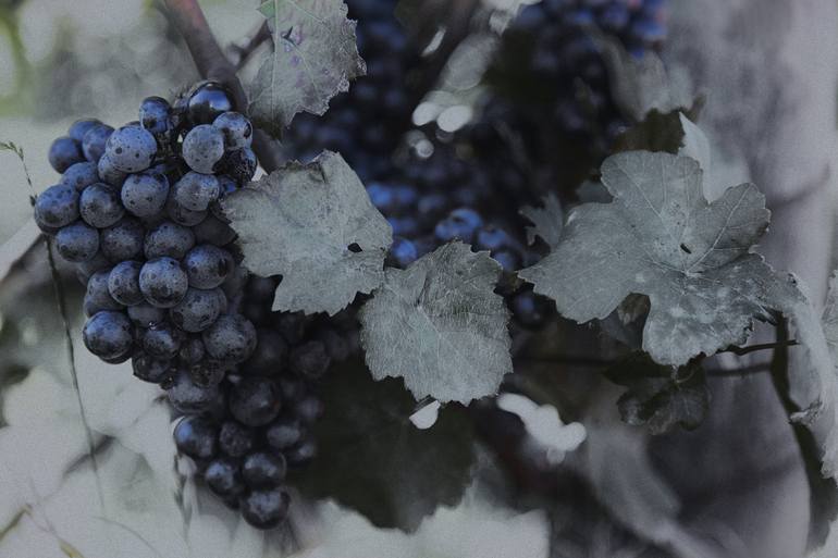 Pinot Noir wine grapes on the vine, ready for harvest. Bainbridge Island, Washington. Printed on glossy aluminum photo panel, ready to hang with rail & wire.