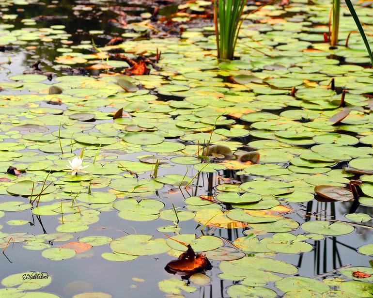 An August New England photograph of a lily pond and one water lily in bloom.