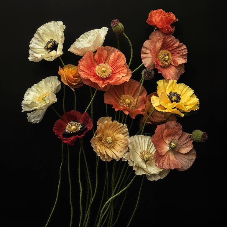 A photograph of several colorful lily's and daisy's against black. Printed on Archival Fine Art Paper