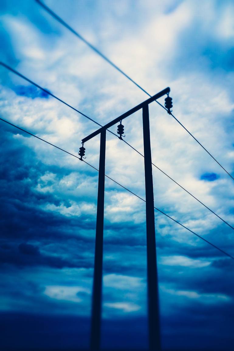 Dramatic low angle view of rural electricity cables intersecting a moody sky. A slightly blurred surreal technique was applied to the work, darkening and emphasising the blue tonality and the cloudy sky.