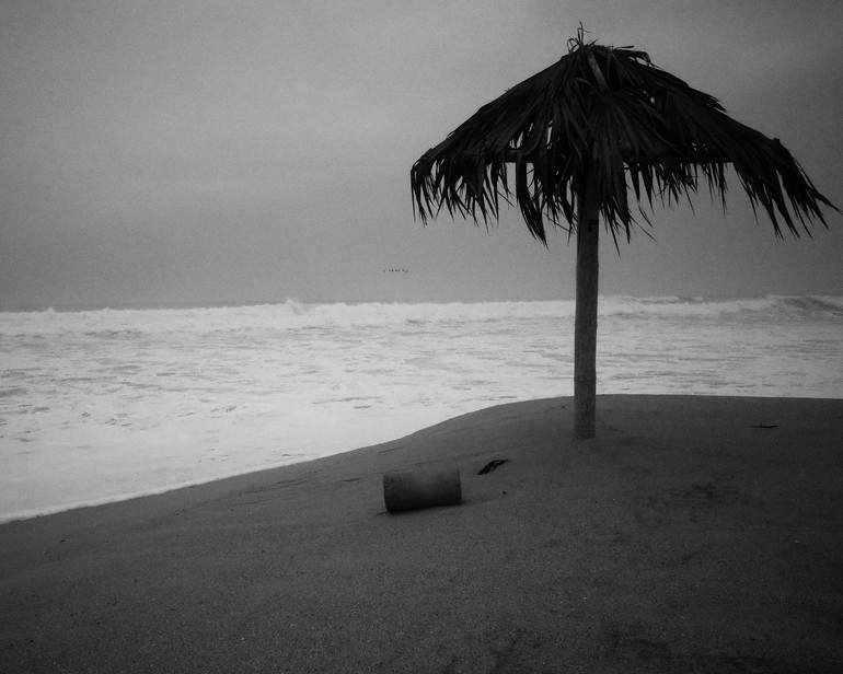 While exploring the coast of Peru I found a desolate beach. The ocean was wild and the swell was huge. This umbrella stood on the sand, frail against the wind and rough seas. Black and white.