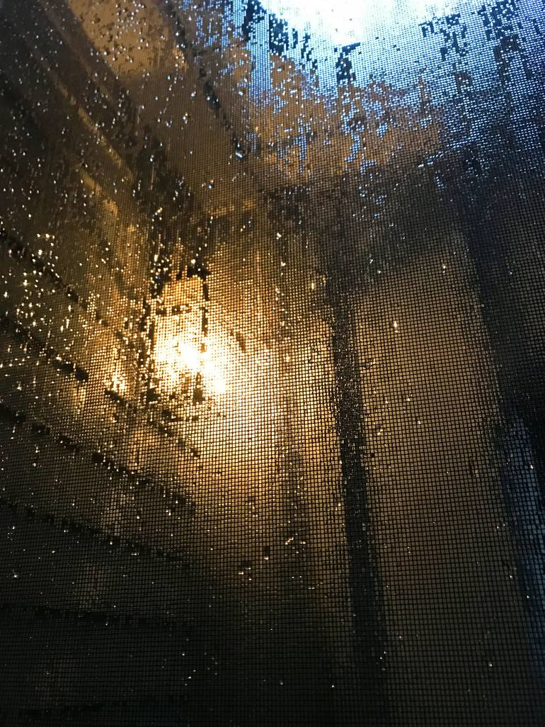 Ready to hang. I was interested in capturing the pattern of water droplets on the door screen, as well as the the play of warm and cool colors. This is a view from an open screened door, and reminds me of summer. This is a digital photo printed on brushed aluminum, with a wire hanger on the back, an...