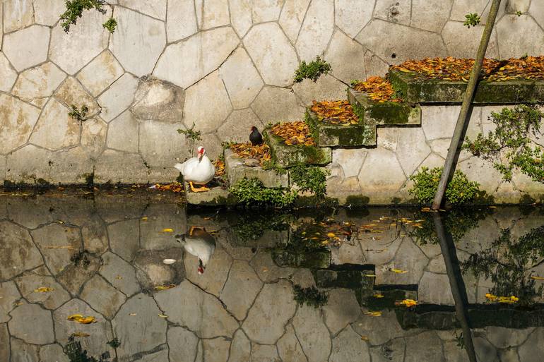Original Artwork (Limited Edition): The motif is printed on Hahnemühle fine art baryta 325g paper, motif size 20 x 30 cm, white border 5 cm, outer size 30 x 40 cm, signed and artist stamp on the back. The Stone Steps and Pond of the Garden Giardino Salvi in Vicenza. A quiet scene unfolds in the Gar...