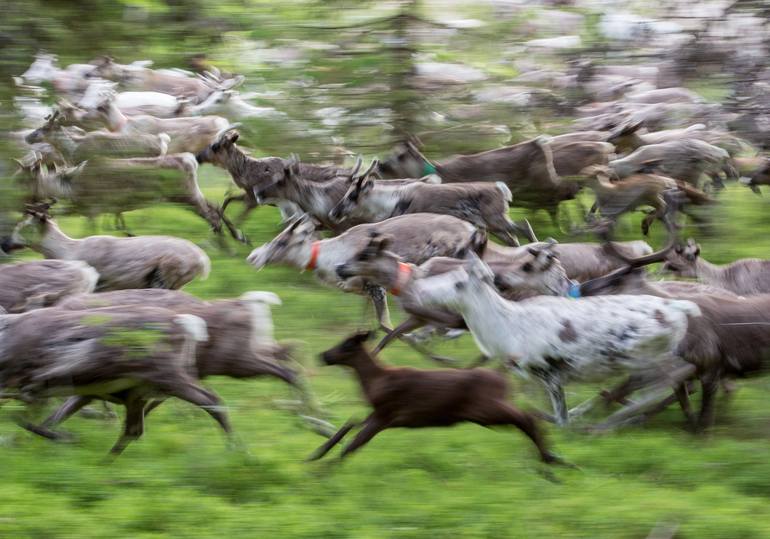 Reindeers around midsummer. The samis gather the animals, and are marking the calfes to keep track of ownership.