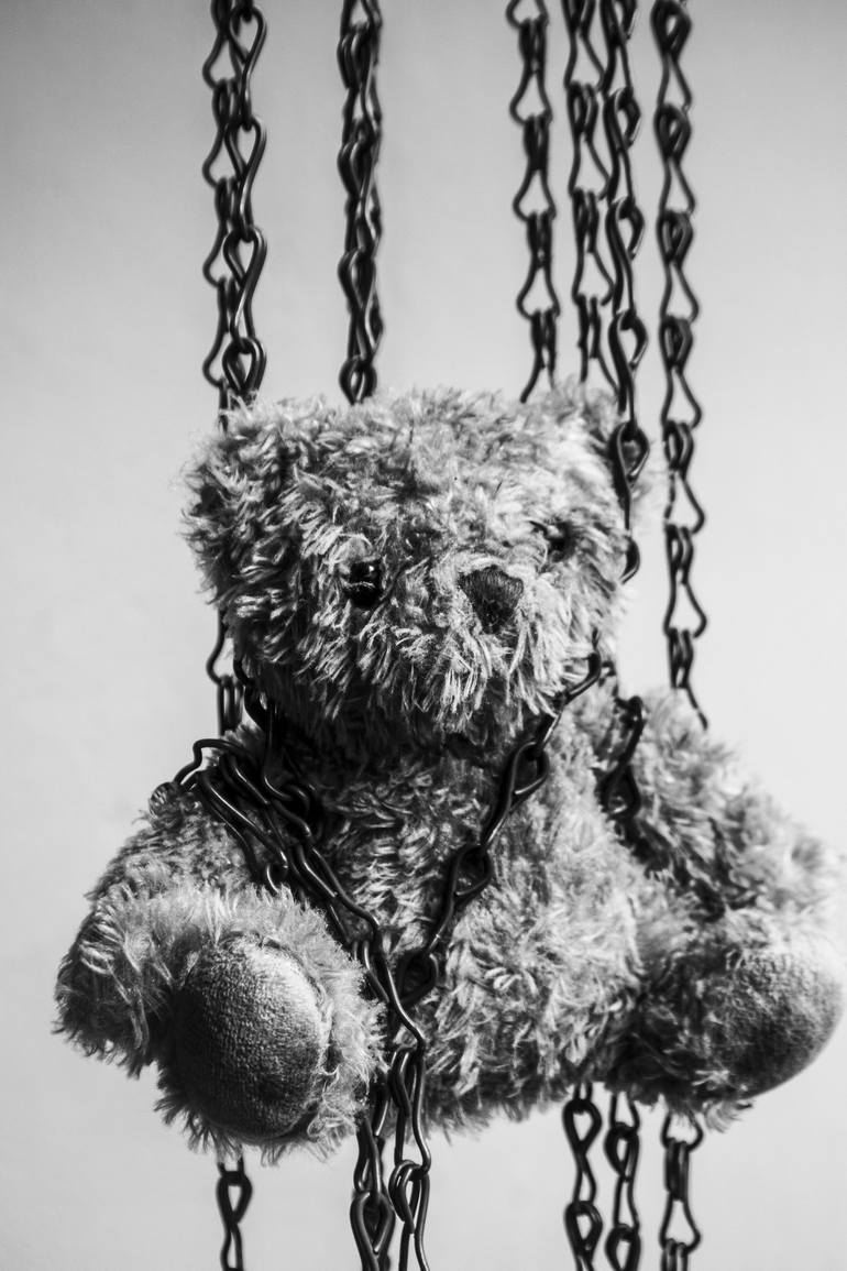A faded antique bear tied on to a chain. This photo is a powerful message to those who think deeply. it can relate to many things surrounding us from personal to social. from child to adult. from thoughts to words. from silence to noise, let it go and let your thoughts be free. Printed on 100% arc...