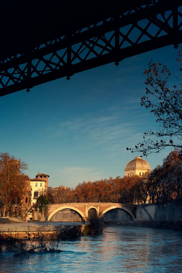 View of the sinagogue in Rome, under the iron bridge. Is it possible to see the tiberina isle on the left