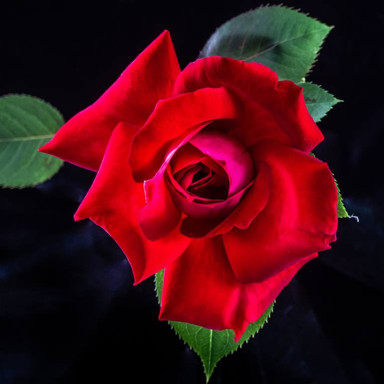 A red rose against a black background, photographed in natural light. The photograph is part of a study of natural light on flowers.