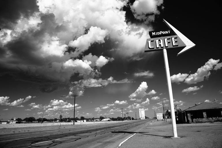 The MidPoint Cafe in Adrian, Texas, is a well known landmark along old Route 66. It is always worth the drive through "miles and miles of Texas" just for a piece of pie at this friendly little place. Black and white version.