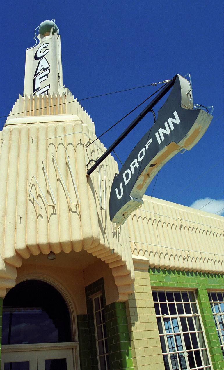 Cafe at the Conoco Station in Shamrock, Texas, on old Route 66. Art Deco in the Panhandle. A classic film image, softer of focus with maybe some lovely film "grain".