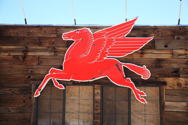 The old Pegasus logo still displayed today at a remote gas station in Arizona. Route 66 is still there, for those who choose to find it.