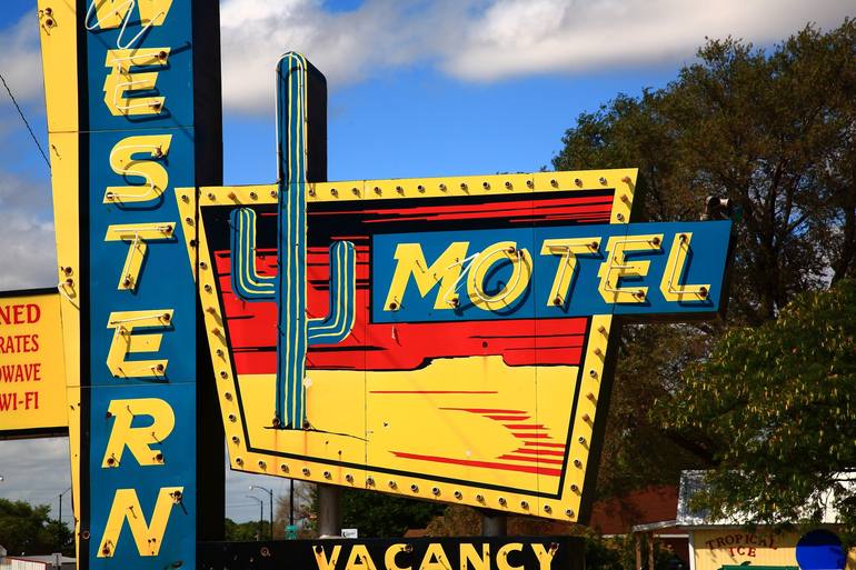 Wonderful cactus and desert welcome sign of the Western Motel on old Rt. 66 in Sayre, Oklahoma. Route 66 is still there, for those who choose to find it.