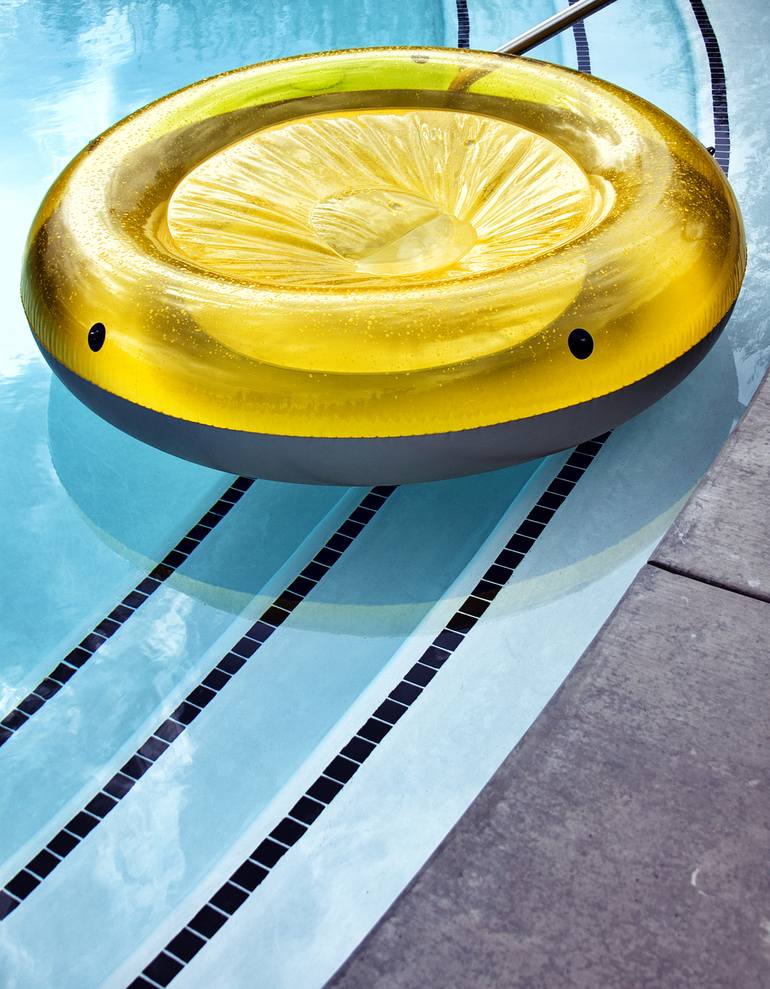 A cheerful yellow inner tube against bright turquoise water captured by photographer William Dey. "SPLASH! Liquid Assets" Art Exhibition Savage Gallery Palm Springs, California. Curated by Shawn Savage Palm Springs, California. Image is printed on crisp white matte Picture Rag museum-quality paper a...