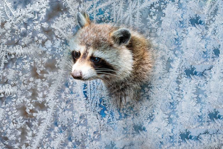 Sad raccoon portrait, view through the frozen window. AP will be included or sent by post to your given address. ABOUT THE ORIGINAL COPIES PRINTING: Canvas roll with matte varnish This canvas has a matte varnish coating. Offering great protection against scratch. It’s a unique blend of cotton e...
