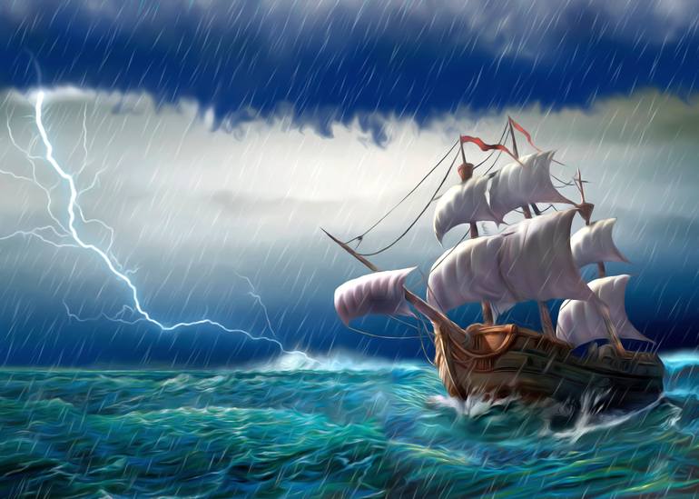 Sailing ship fighting waves and storm in the ocean Overcoming wind, rain and waves, sailors rush to their port, where children and wives are waiting for them. Nothing can stop the selfless heroism of the courageous sailors. No adversity of nature will stop them. The sailors heroically prove the supe...