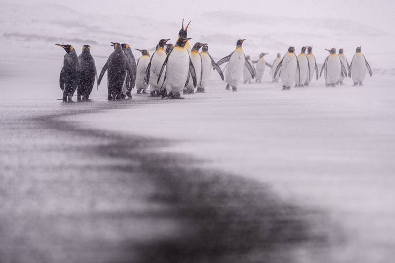 This piece captures the tranquil beauty of king penguins on Salisbury Plain, inspired by the harmony of wildlife and nature. It aims to evoke awe for these resilient creatures and awareness of ecosystem preservation. The sandy texture contrasts with the penguins' sleek plumage, crafted with premium ...
