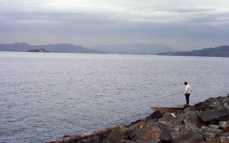 A fisherman enjoys his solitude on a stormy San Francisco Bay. A classic film image, softer of focus with maybe some lovely film "grain".